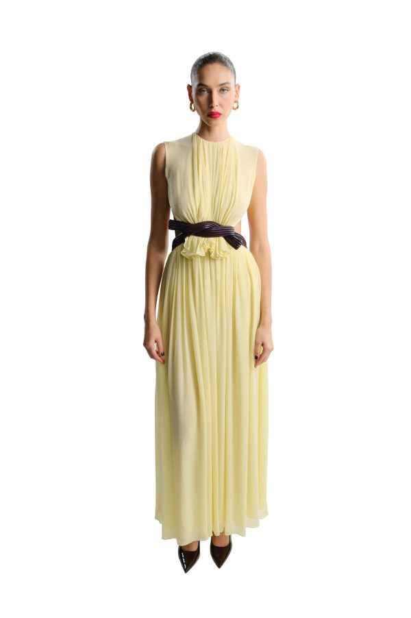 PALE YELLOW CHIFFON DRESS – LEATHER WAIST DETAIL